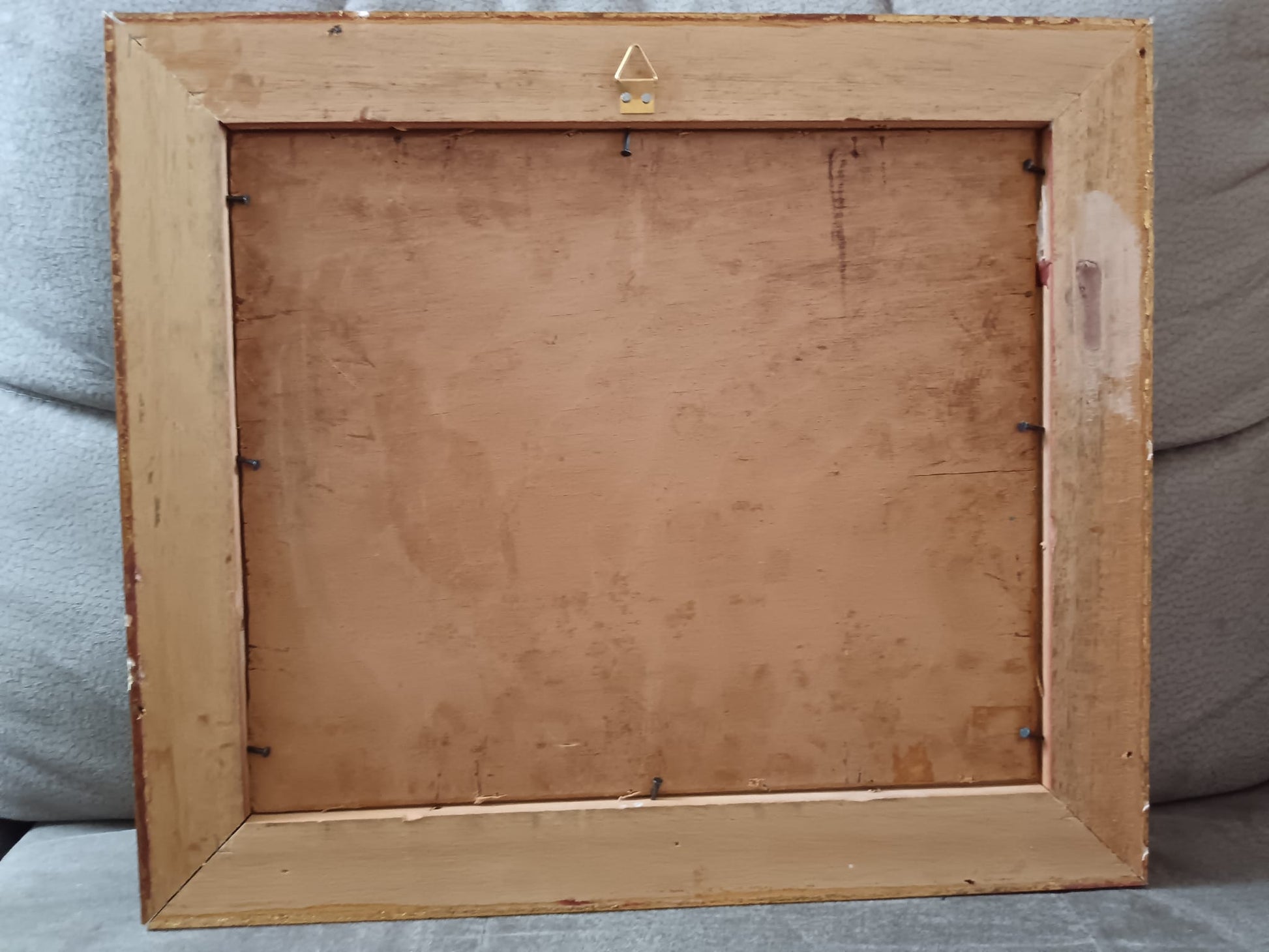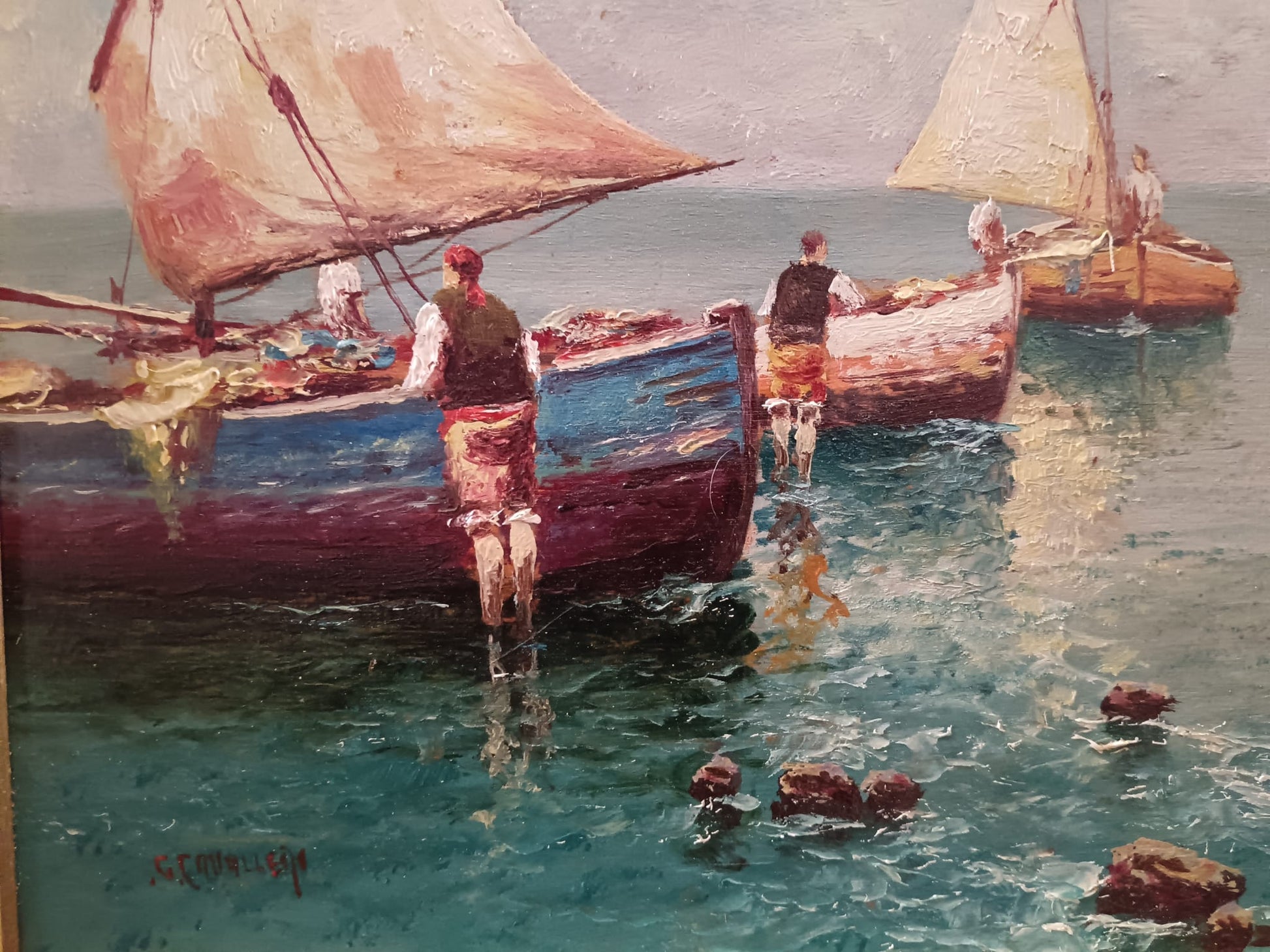 L'immagine mostra un dipinto incorniciato che raffigura un paesaggio marino con imbarcazioni a vela, caratterizzato da colori vivaci e una prospettiva che suggerisce il movimento del mare e delle vele.