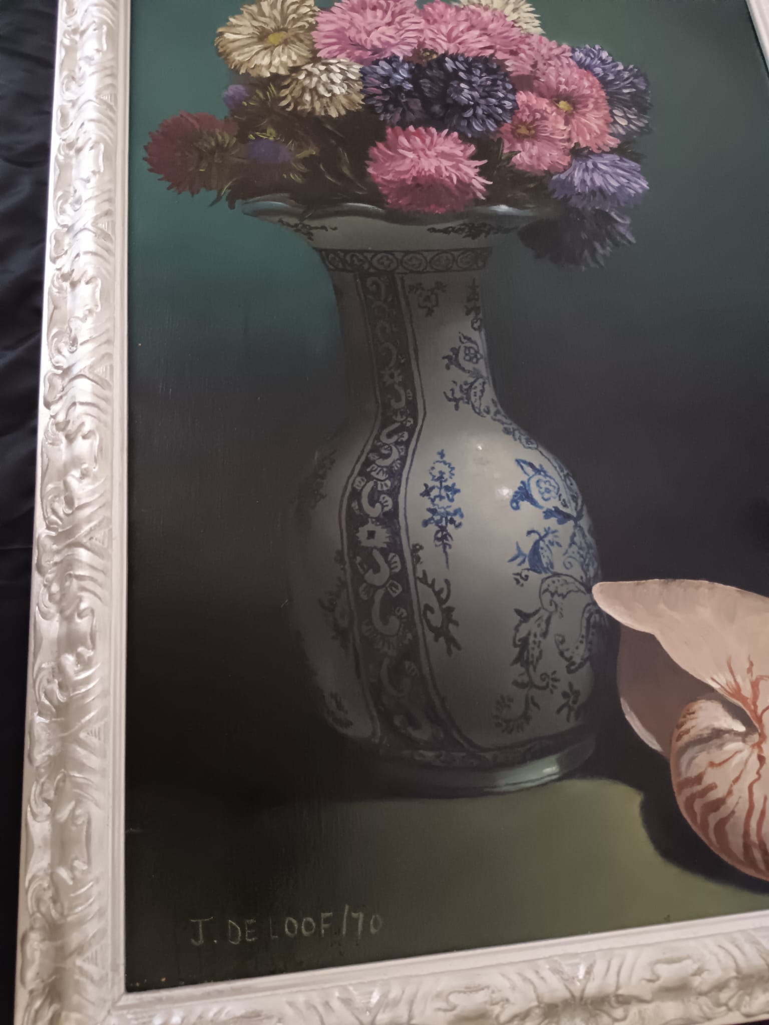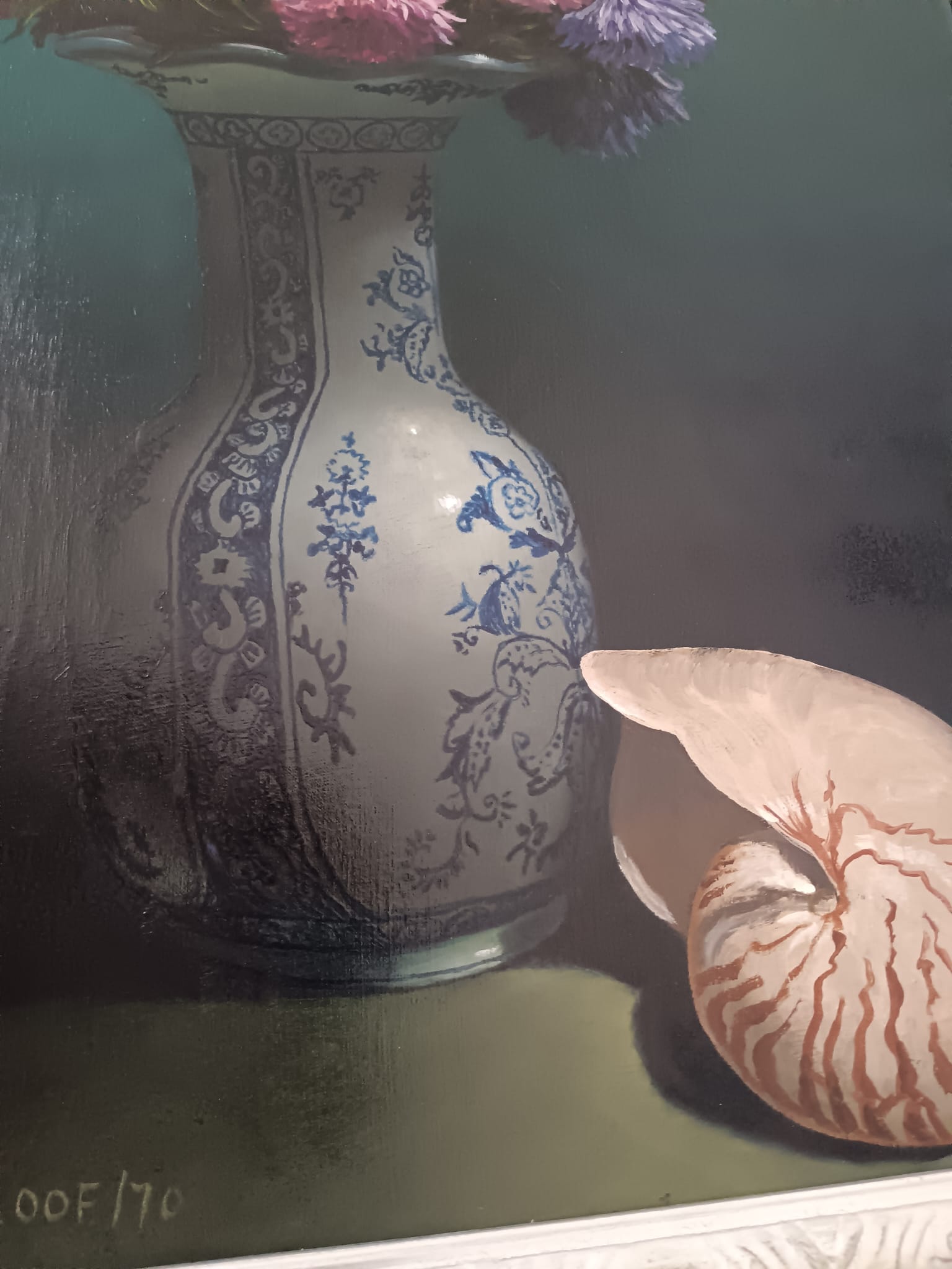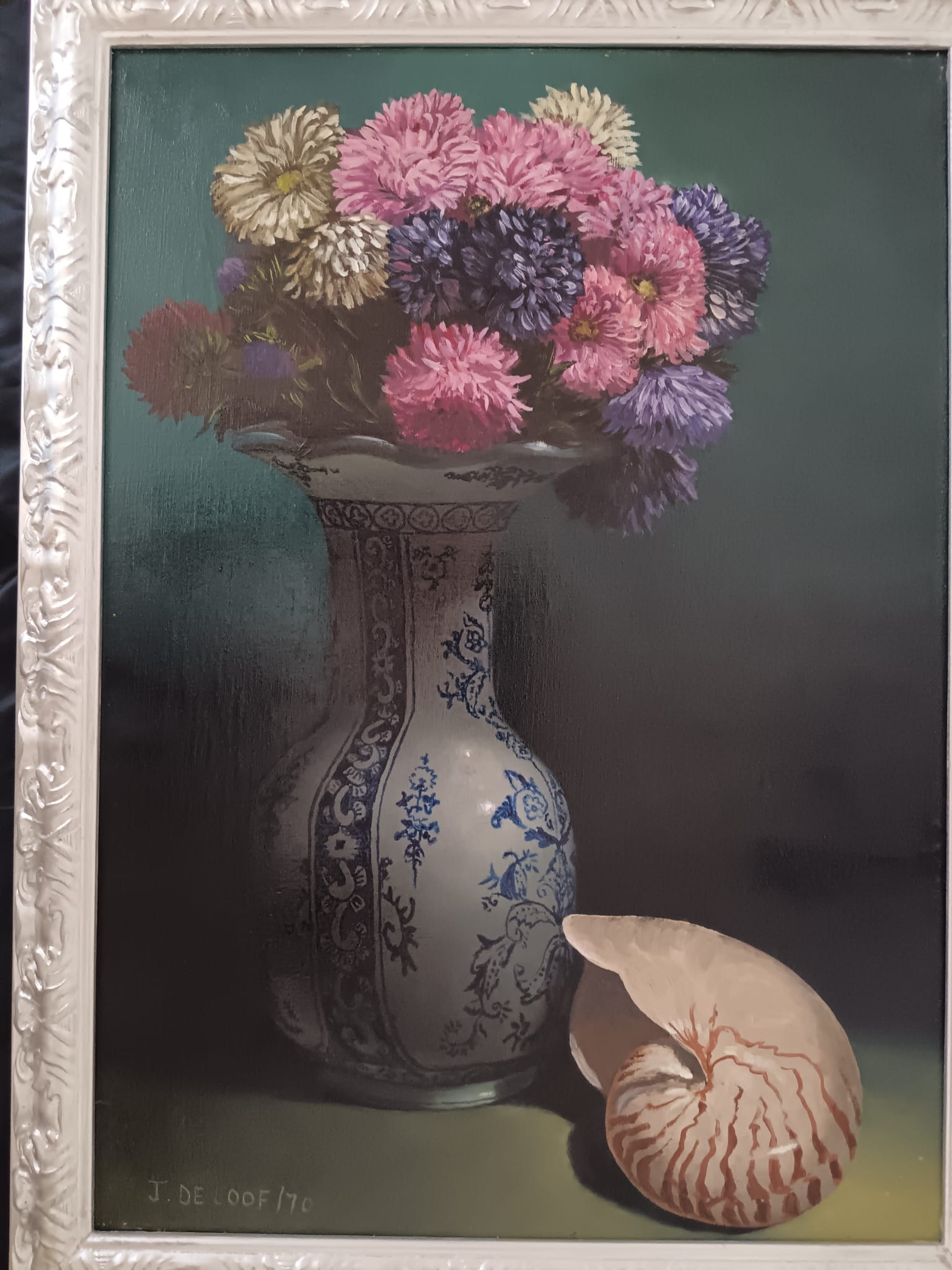 Il vaso è decorato con motivi blu e bianchi che ricordano la porcellana cinese o olandese.I fiori nel vaso sembrano essere astri o simili, con tonalità di rosa, viola e blu.La conchiglia di nautilus, con la sua caratteristica forma a spirale, è posta in primo piano a destra, aggiungendo un elemento di interesse naturale alla composizione.L'illuminazione crea un contrasto tra le aree illuminate e quelle in ombra, mettendo in risalto gli oggetti della natura morta.