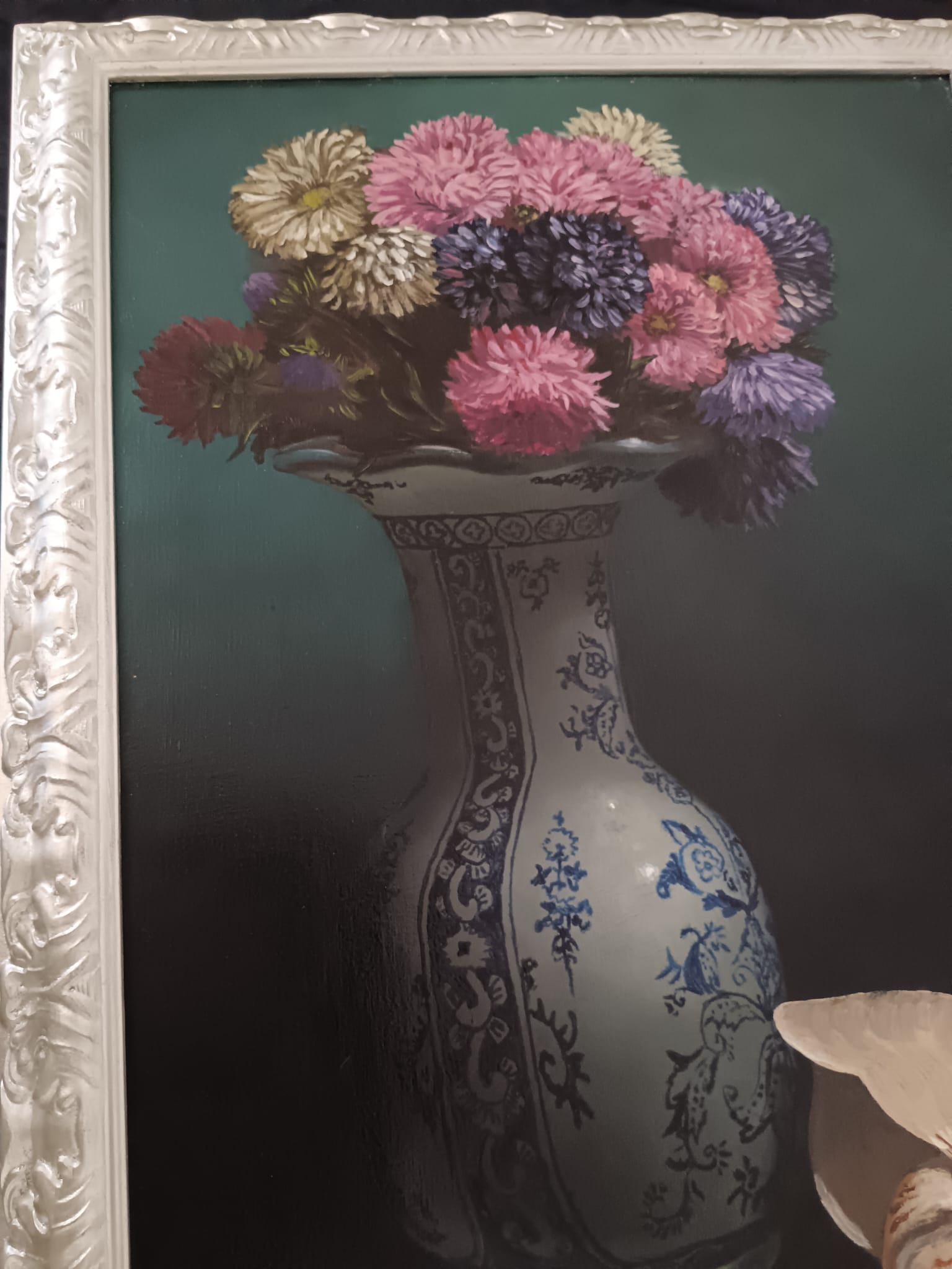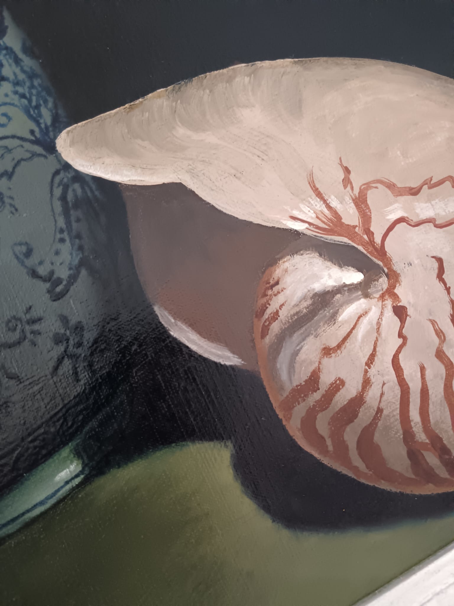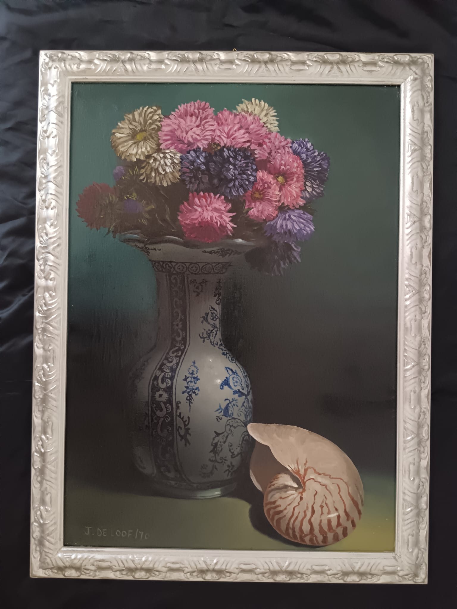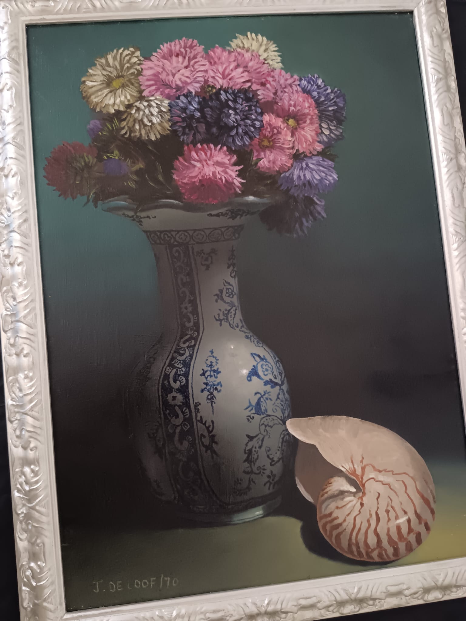Il vaso è decorato con motivi blu e bianchi che ricordano la porcellana cinese o olandese.I fiori nel vaso sembrano essere astri o simili, con tonalità di rosa, viola e blu.La conchiglia di nautilus, con la sua caratteristica forma a spirale, è posta in primo piano a destra, aggiungendo un elemento di interesse naturale alla composizione.L'illuminazione crea un contrasto tra le aree illuminate e quelle in ombra, mettendo in risalto gli oggetti della natura morta.