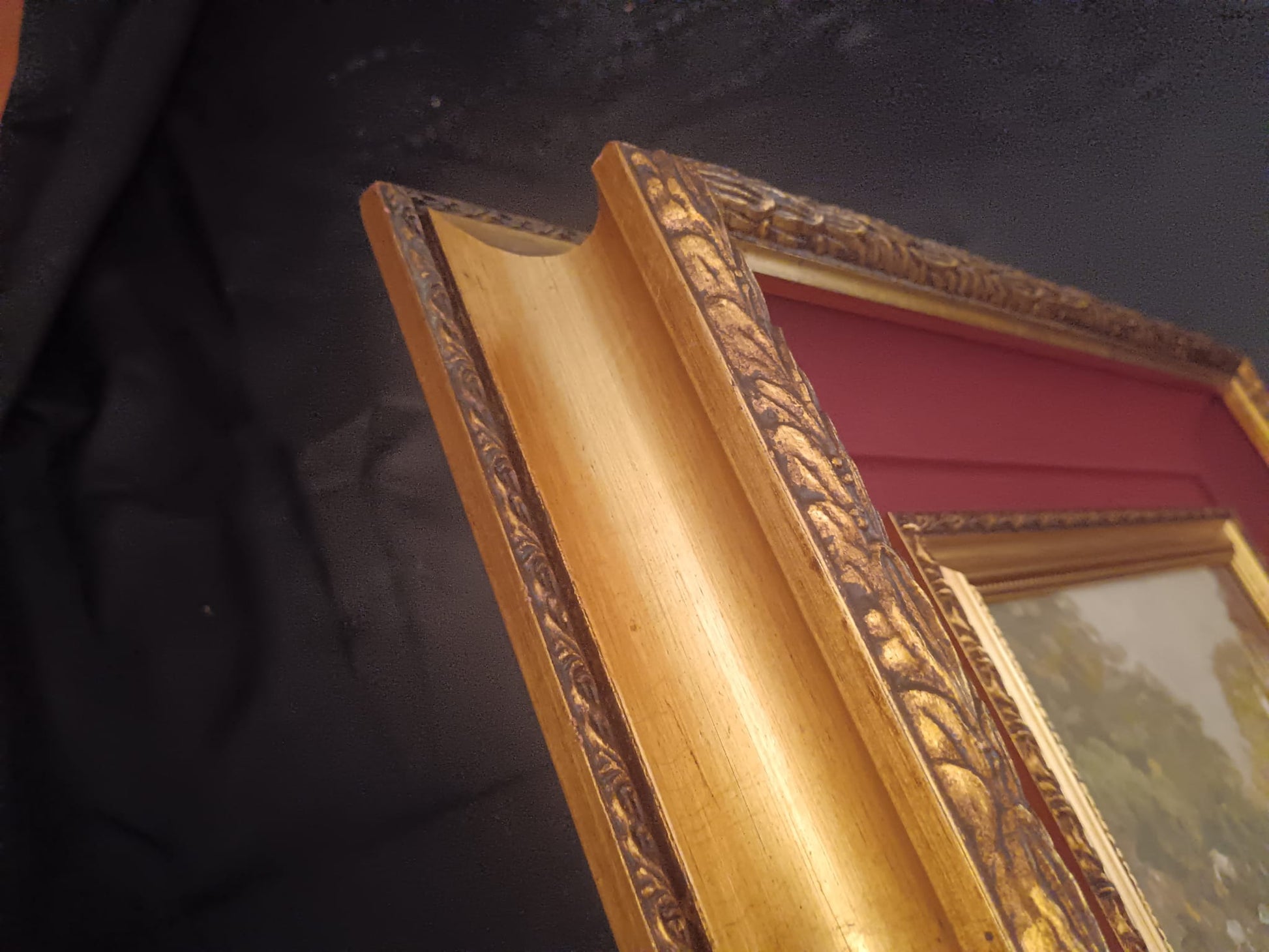 Cornice originale in legno dorato con passepartout in tessuto amaranto.