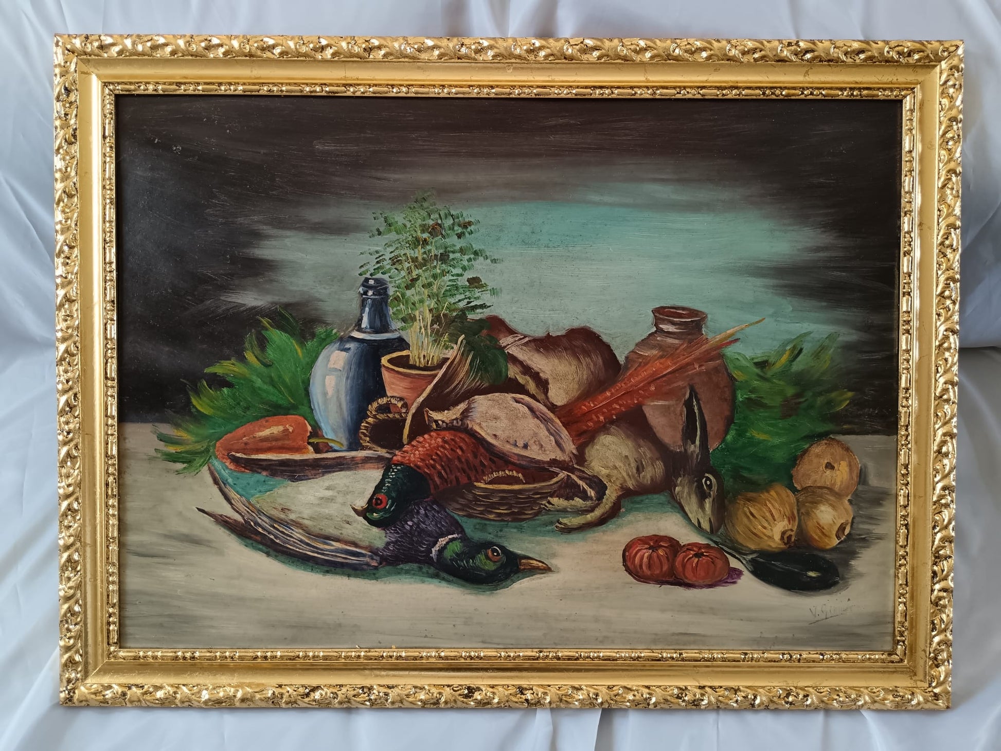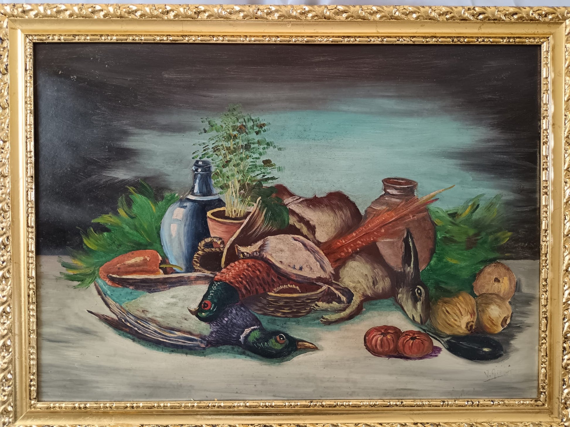 In questo caso specifico, il dipinto presenta una composizione con selvaggina , frutta e verdura , oggetti come bottiglie e un vaso, e un cestino, creando una scena di abbondanza e preparazione per un pasto successivo alla caccia.