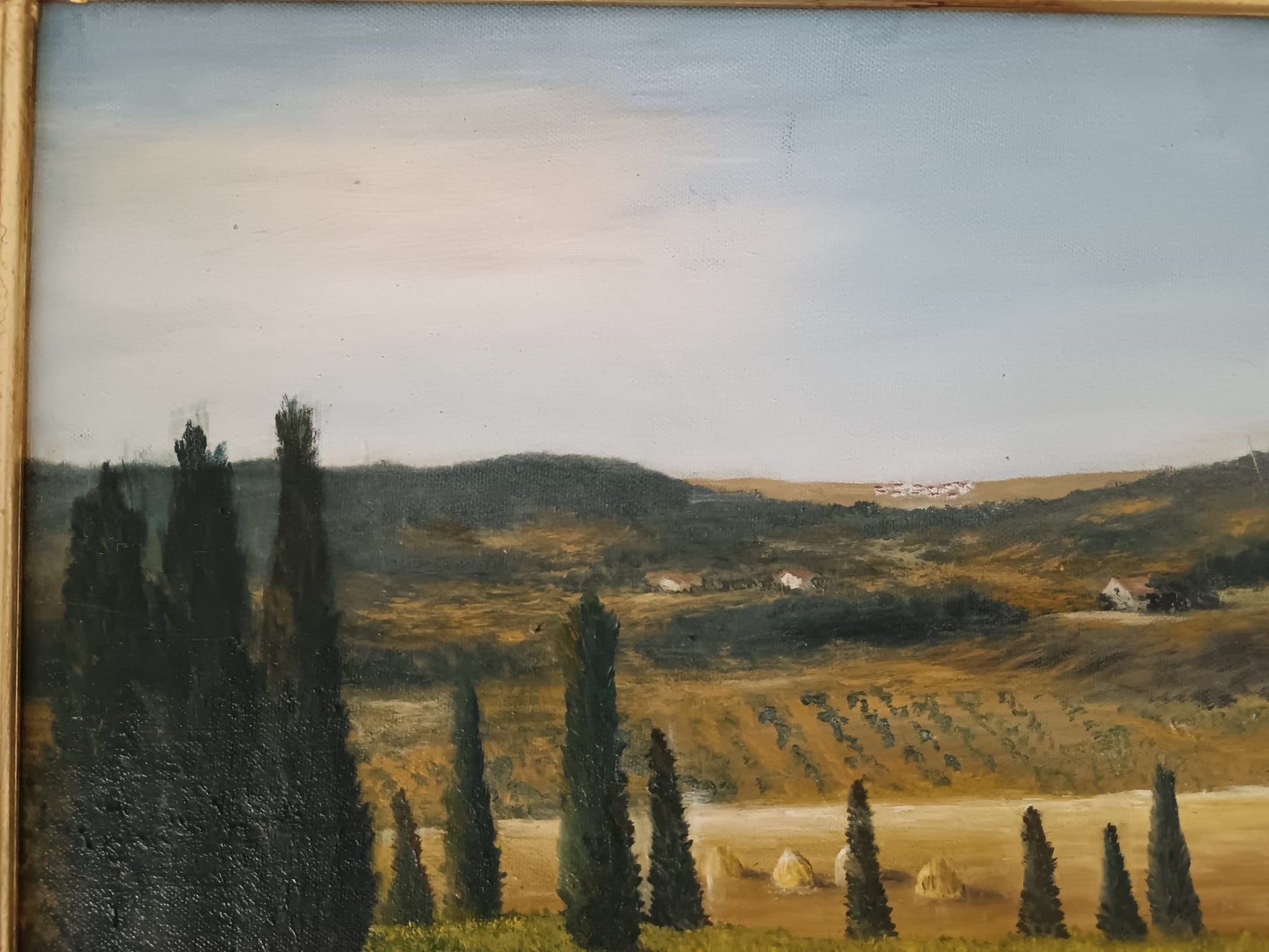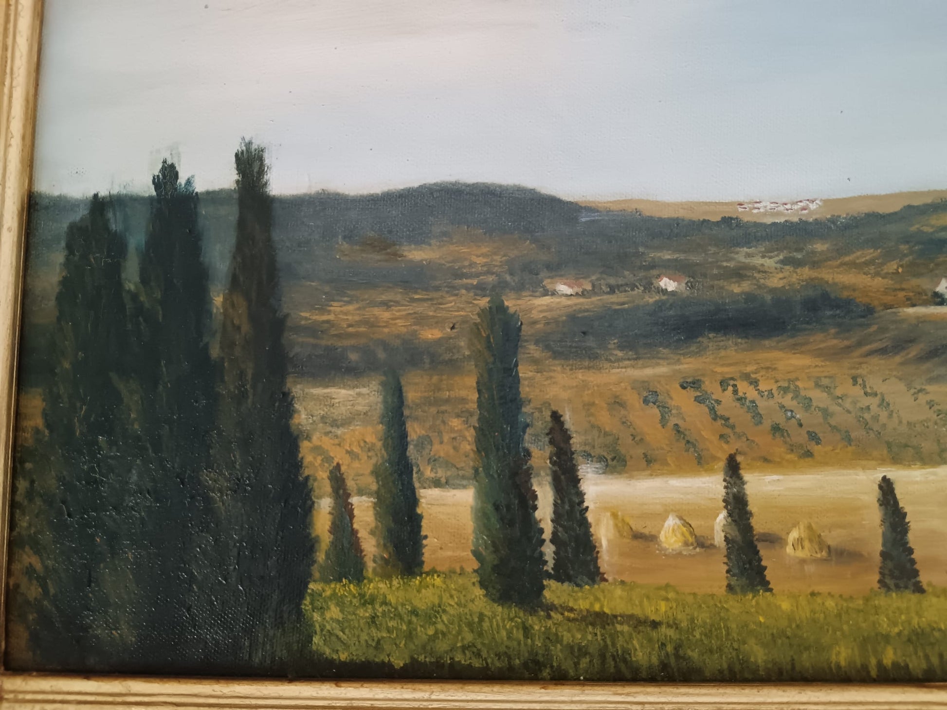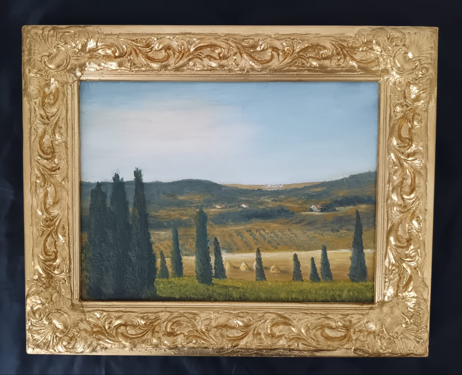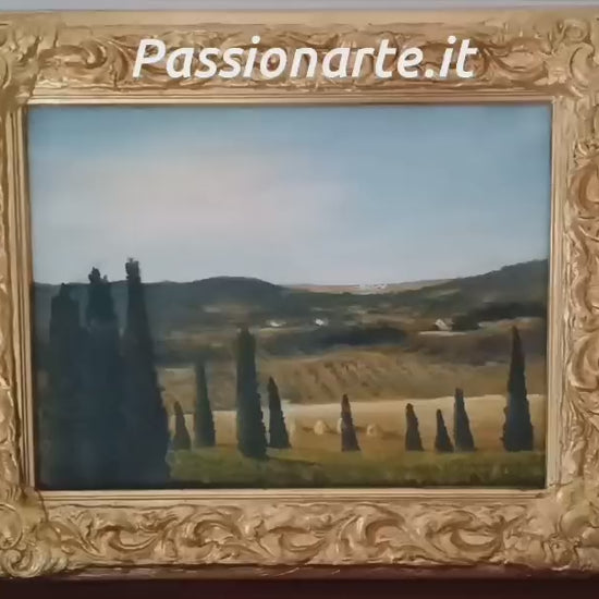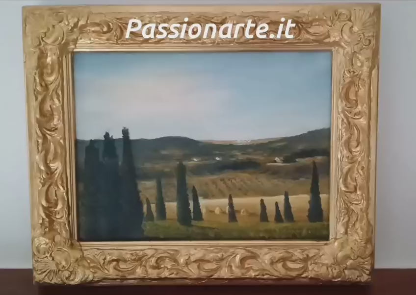 Il dipinto raffigura un paesaggio collinare toscano, con campi coltivati e un gruppo di cipressi in primo piano.Si possono notare anche alcune costruzioni sparse tra le colline sullo sfondo.La cornice è riccamente decorata con motivi a volute e fogliame in stile classico .Firmato in basso a destra.