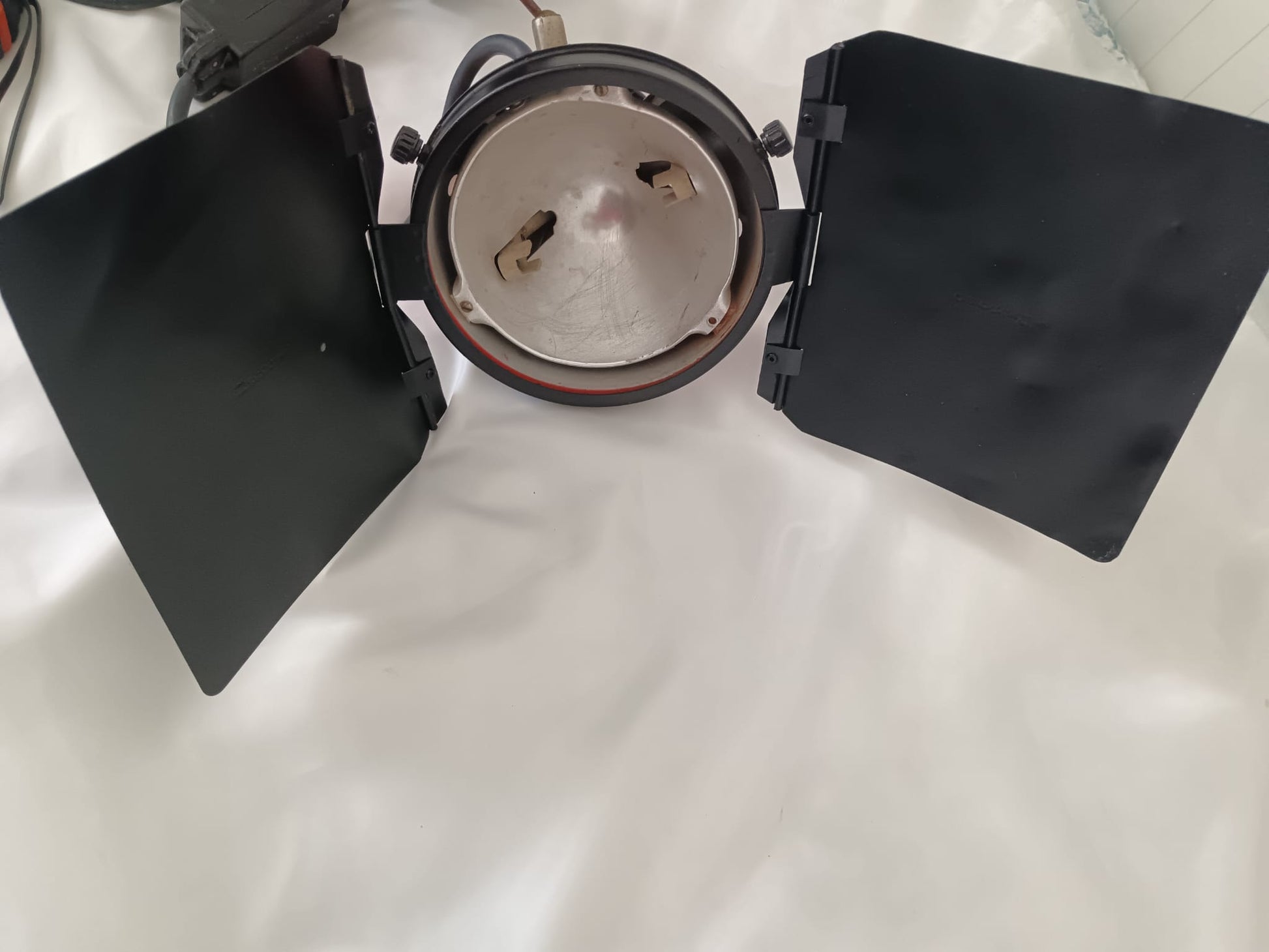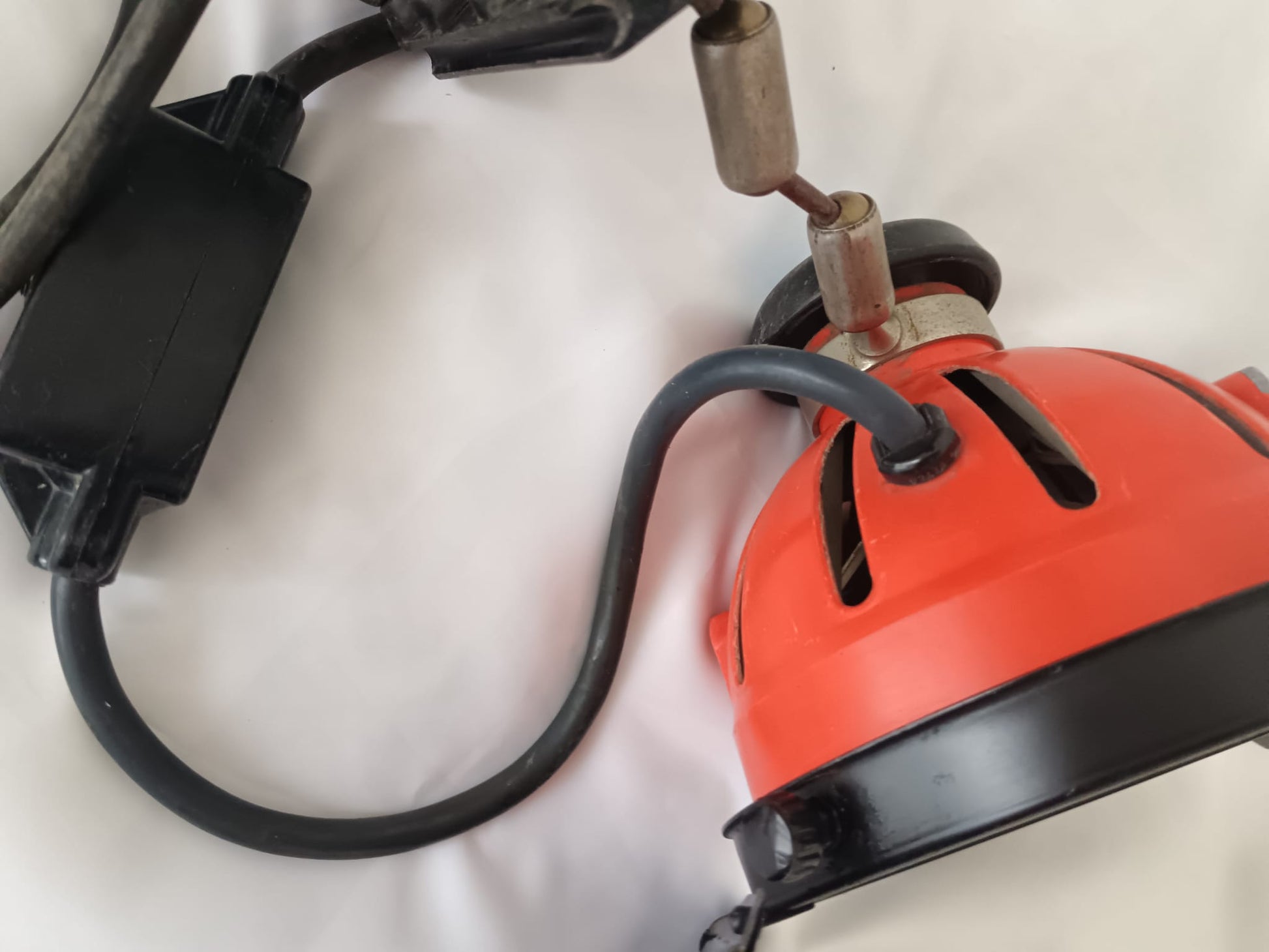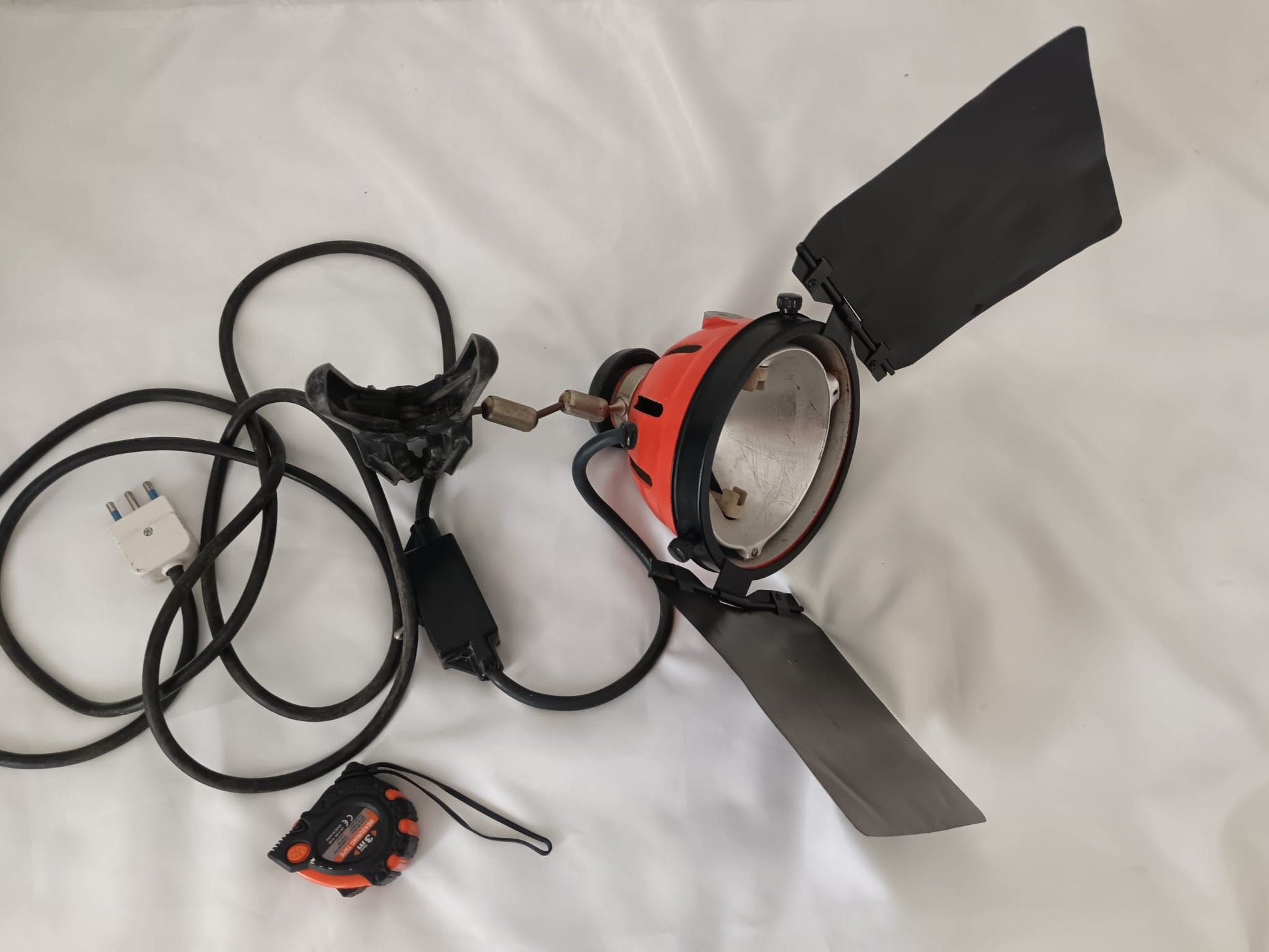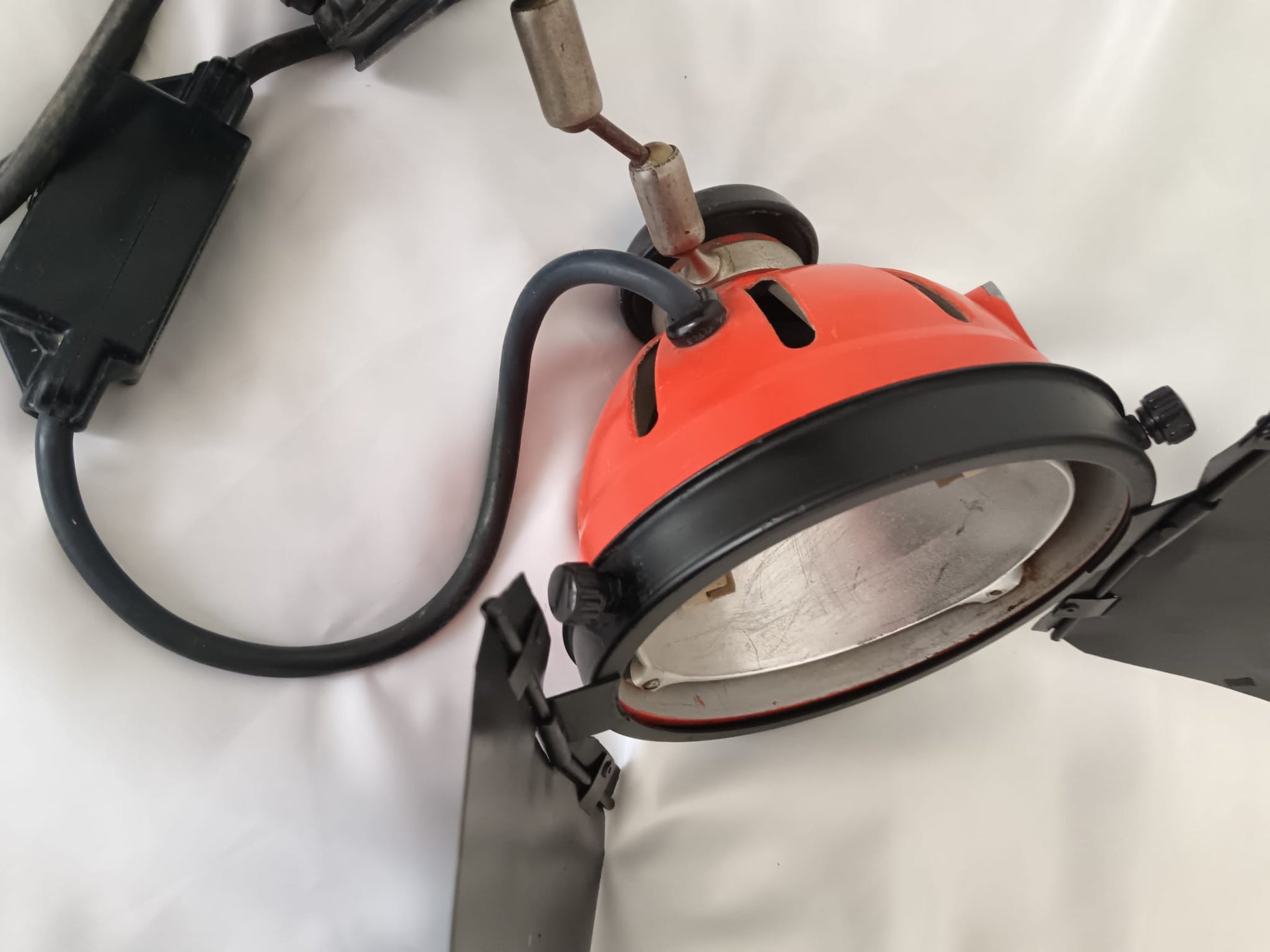 - Montato sulla sua pinza dell'epoca orientabile in tutte le direzioni di colore arancione, cavo originale e interruttore originale dell'epoca cavo lungo 3 mt. Pinza pesante colore nero. Lampadina mancante, attacco lampadina R7.